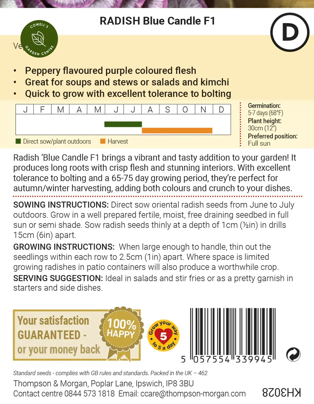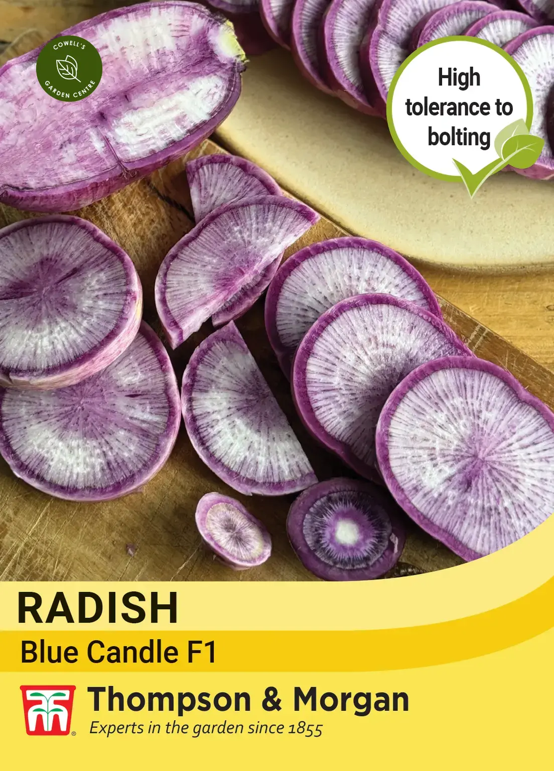 Peppery purple roots with purple hearts! Add a splash of colour to your autumn/winter veg patch Winter Radish ‘Blue Candle’. This striking variety features elongated blue-purple roots with vibrant purple centres.