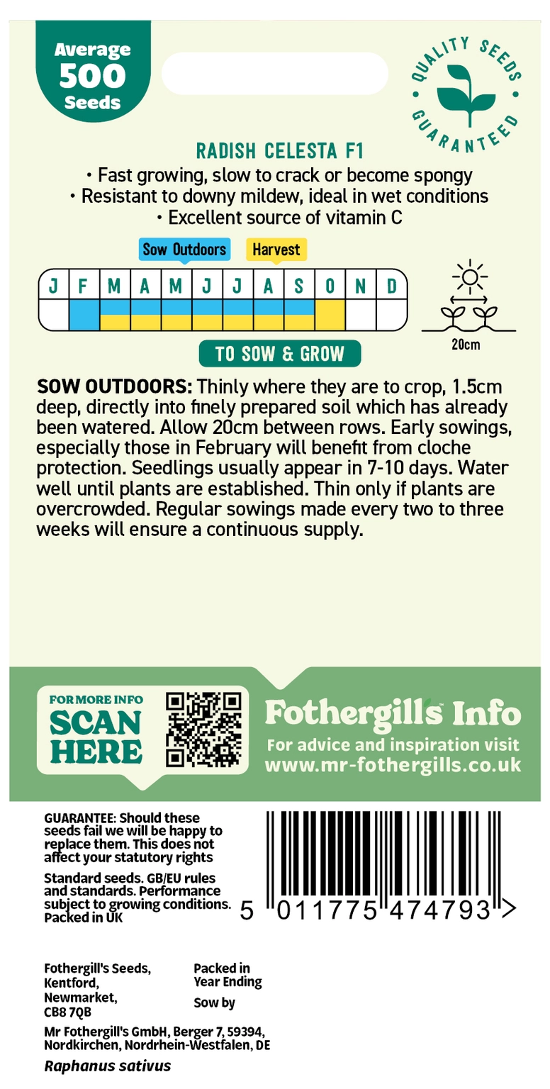Quick growing, resists downy mildew. For best quality harvest when roots are small. Save space by sowing between slower growing veg.