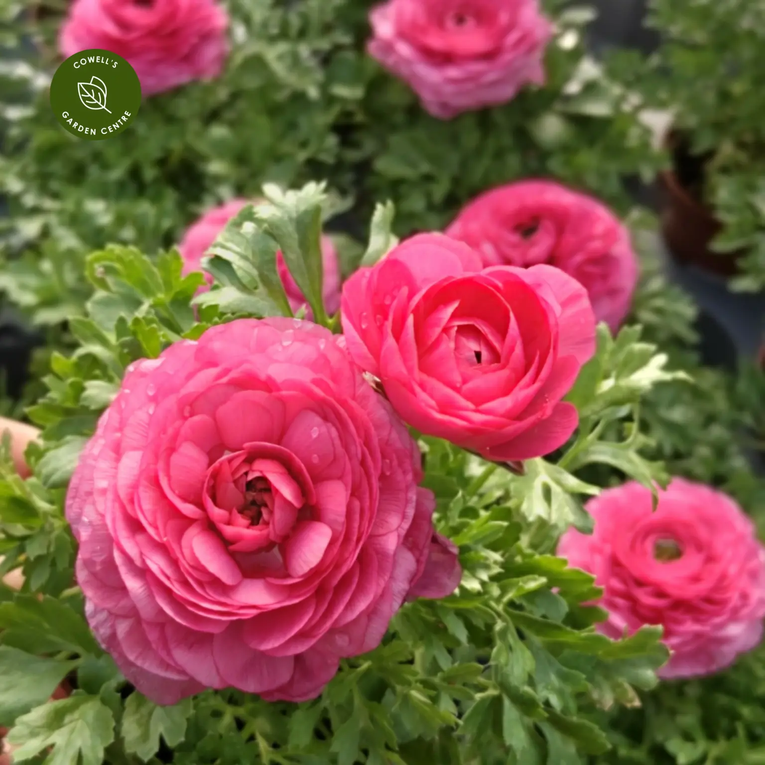 Ranunculus asiaticus 'Pink' is a beautiful spring-flowering perennial producing layers of delicate, rose-like vivid pink blooms. The softly ruffled flowers appear in abundance above neat mounds of finely divided green foliage, creating an elegant and romantic display in the garden.