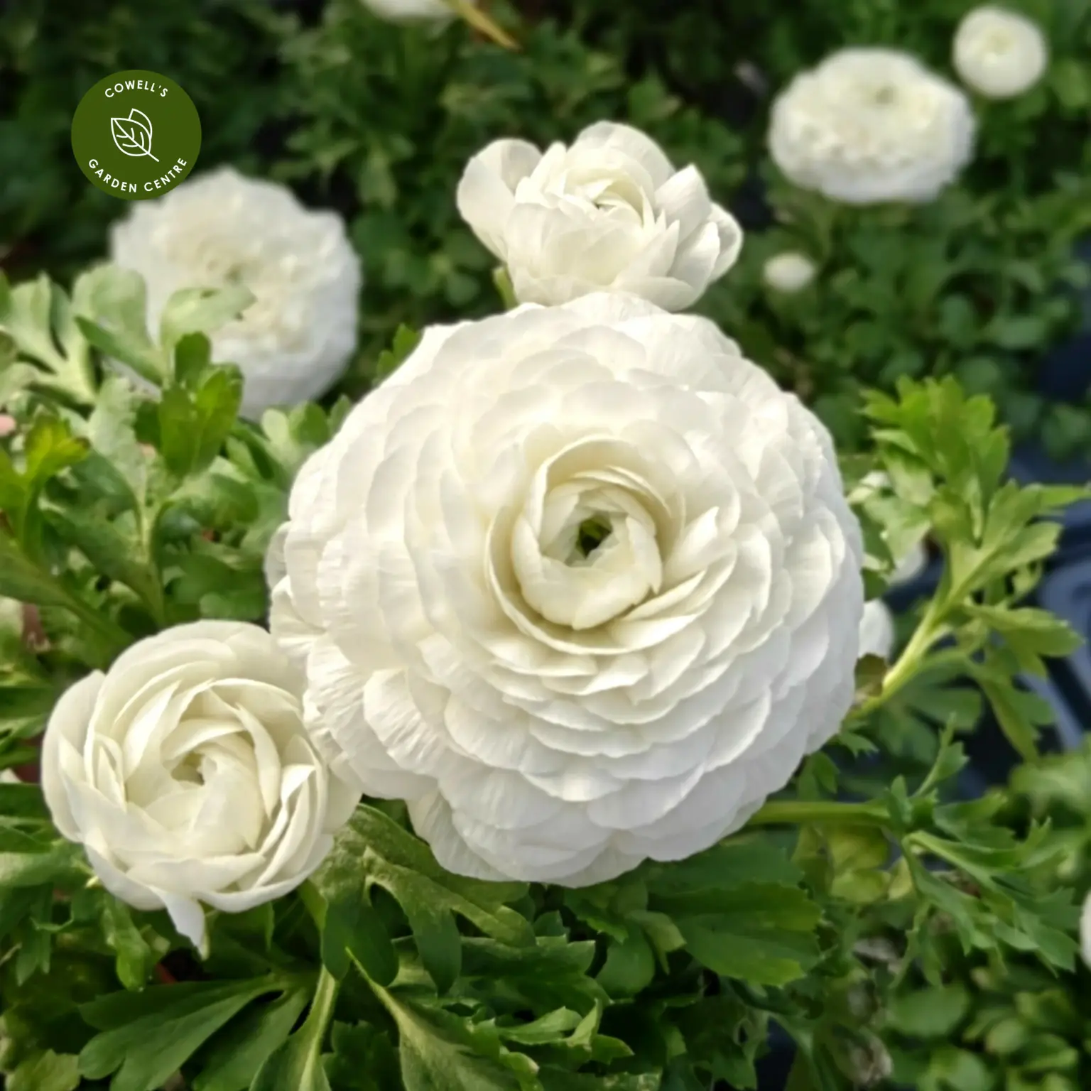 Ranunculus asiaticus 'White' produces elegant, layered white flowers resembling miniature roses. The beautifully formed blooms sit above finely divided foliage, creating a refined and romantic display in spring.