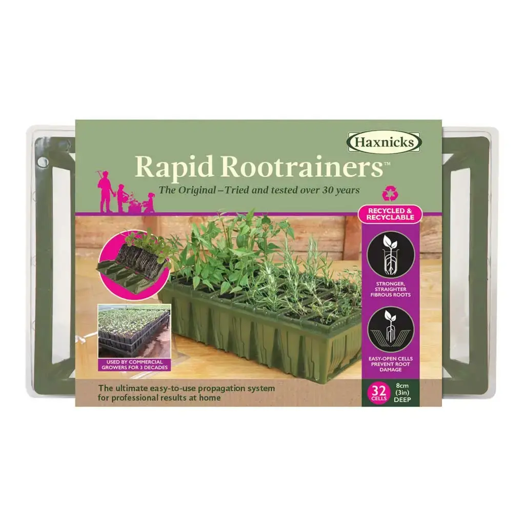 The Rapid Rootrainer pack contains 32 reusable cells, 8cm deep, with holding tray and propagating lid.