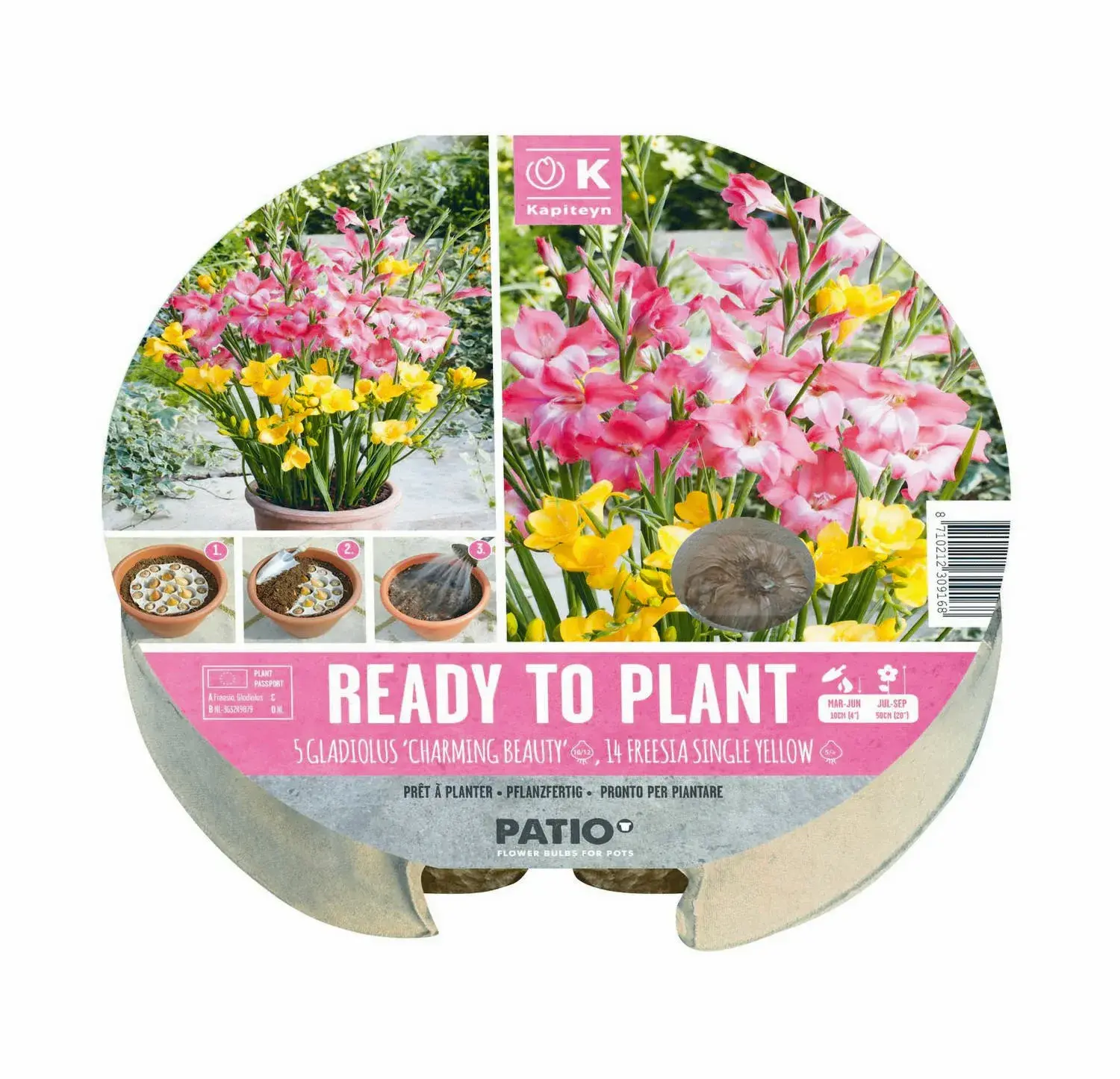 Summery combination of pink Gladiolus and yellow Freesia in a biodegradable tray, ready to insert straight into a pot for optimal flower spacing.