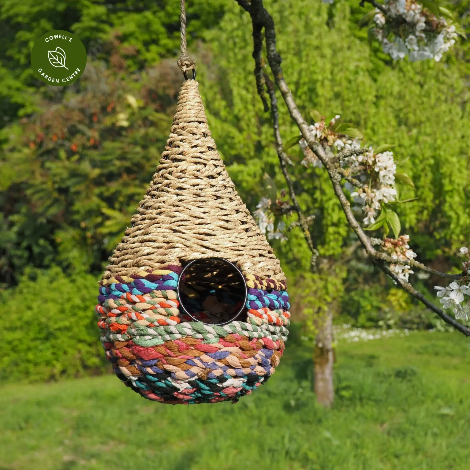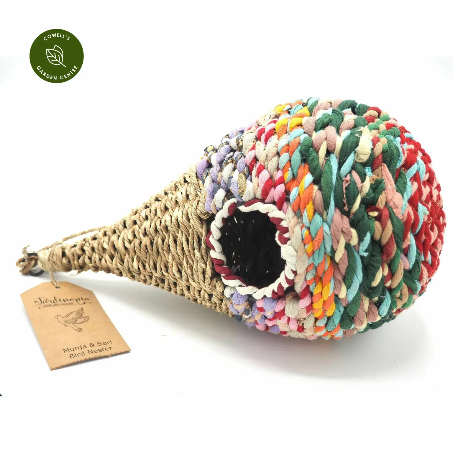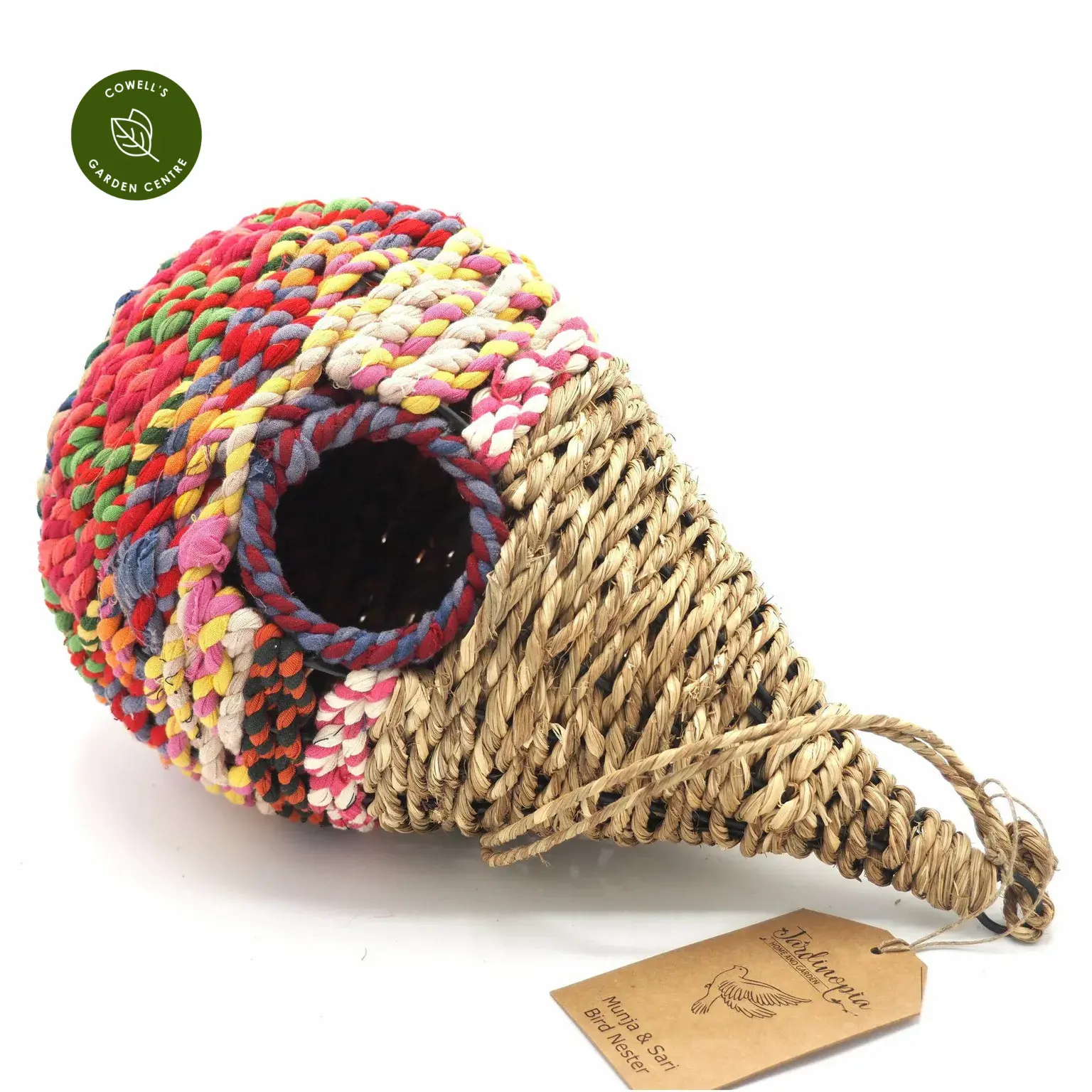Munja and Sari Bird Nesters are handcrafted in India using reclaimed sari fabric from factory offcuts that have been carefully collected, washed, and artfully woven together with sustainably sourced munja grass. The result is a truly unique, eco-friendly home for your garden birds.