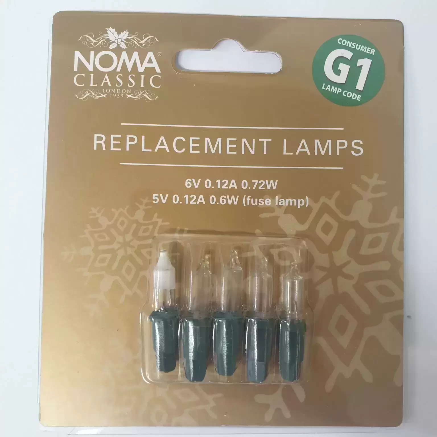 Noma® G1 6v Replacement lamps pack. Set includes 5 bulbs. Simply match the consumer lamp code G1 with that on the cable label wrapped near the plug, to ensure these correctly correspond with your light set.