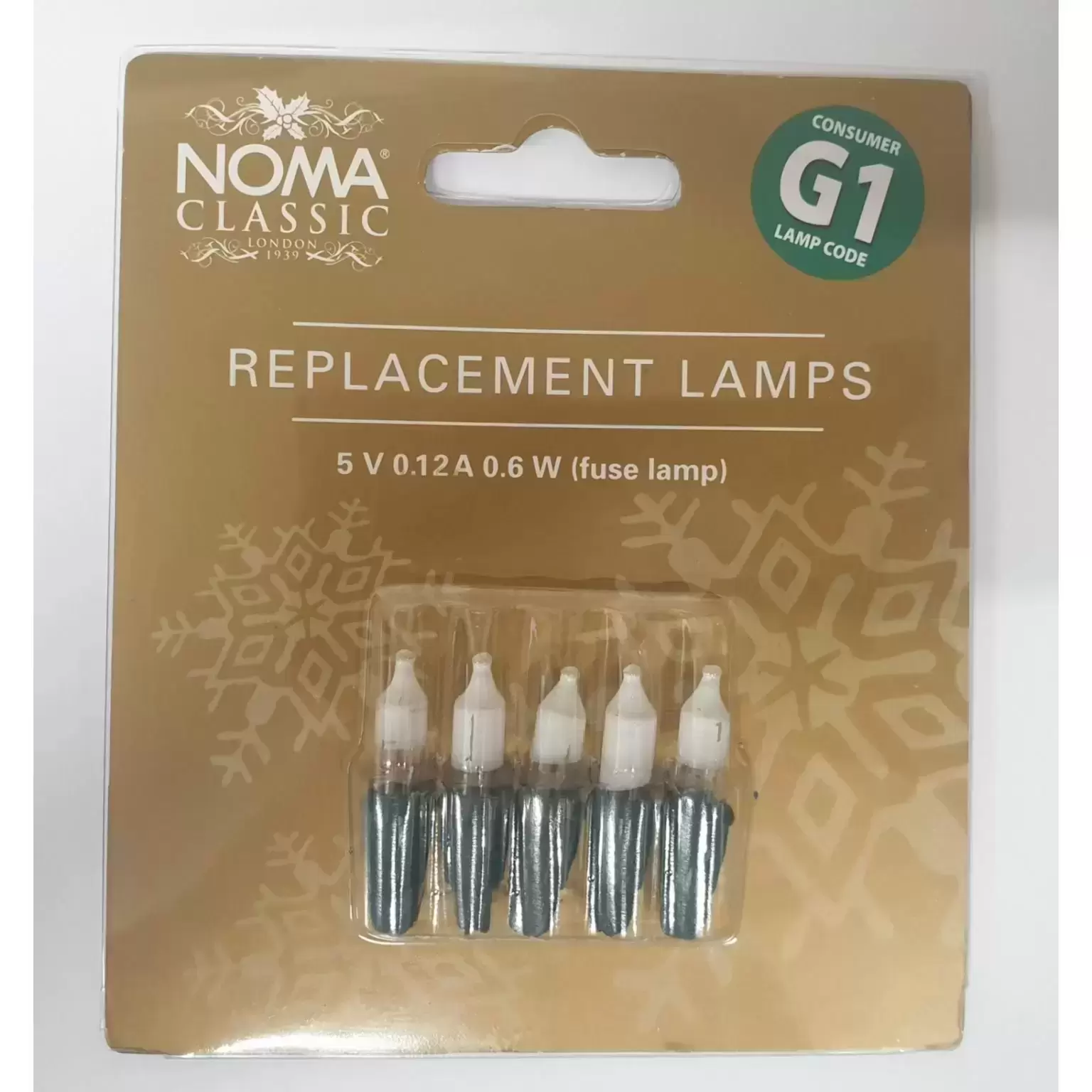 Noma® G1 6v Replacement lamps pack. Set includes 5 bulbs. Simply match the consumer lamp code G1 with that on the cable label wrapped near the plug, to ensure these correctly correspond with your light set.
