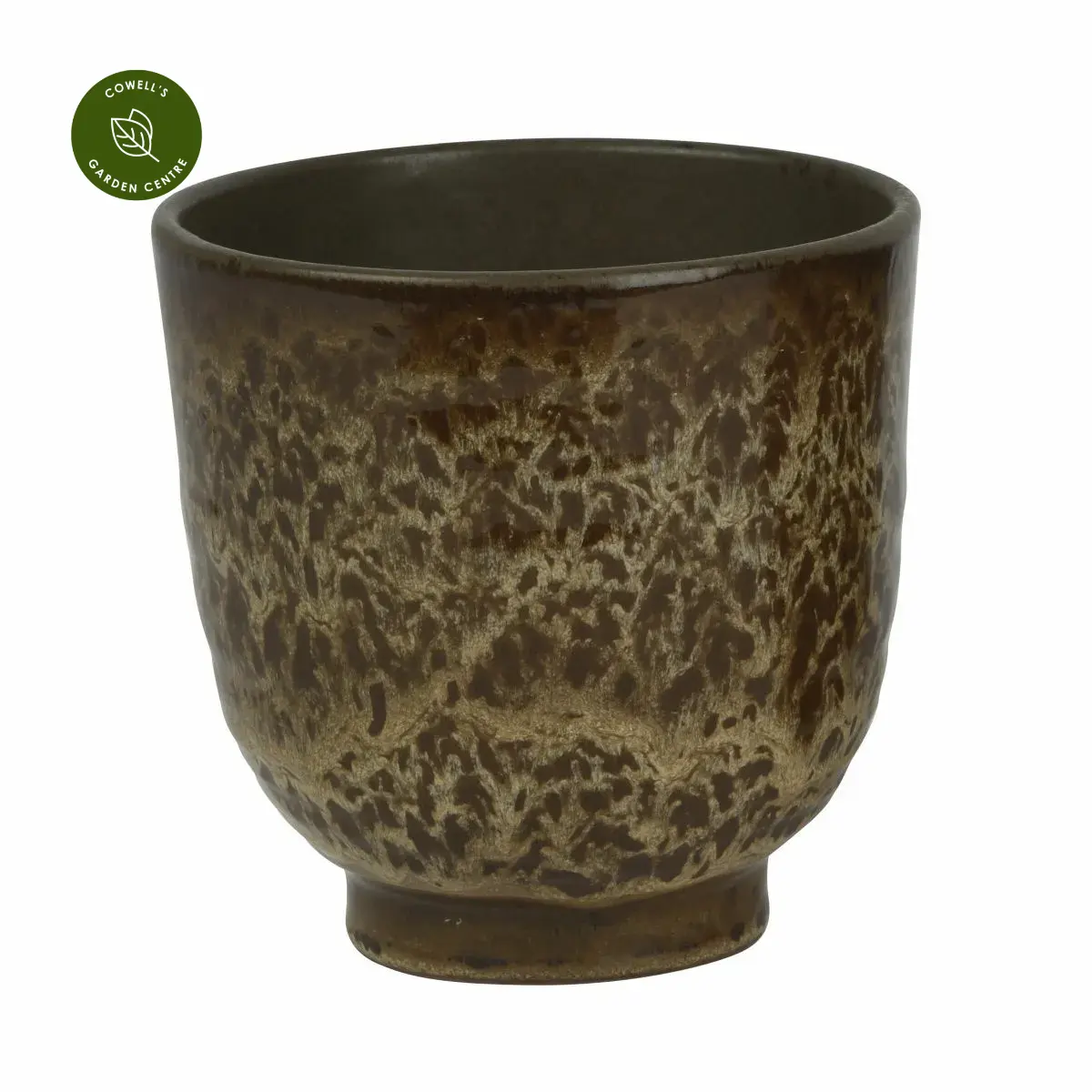 A stylish ceramic planter featuring a rich brown reactive glaze finish, perfect for showcasing houseplants indoors. Its classic shape and textured surface add warmth and character to shelves, tables, or windowsills.
