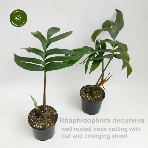 Rhaphidophora decursiva is a bold and fast-growing tropical climber with large, glossy green leaves that develop deep splits as they mature, giving it a dramatic, palm-like appearance. The transformation from simple juvenile leaves to highly divided mature foliage makes it a fascinating and ever-changing feature plant.
