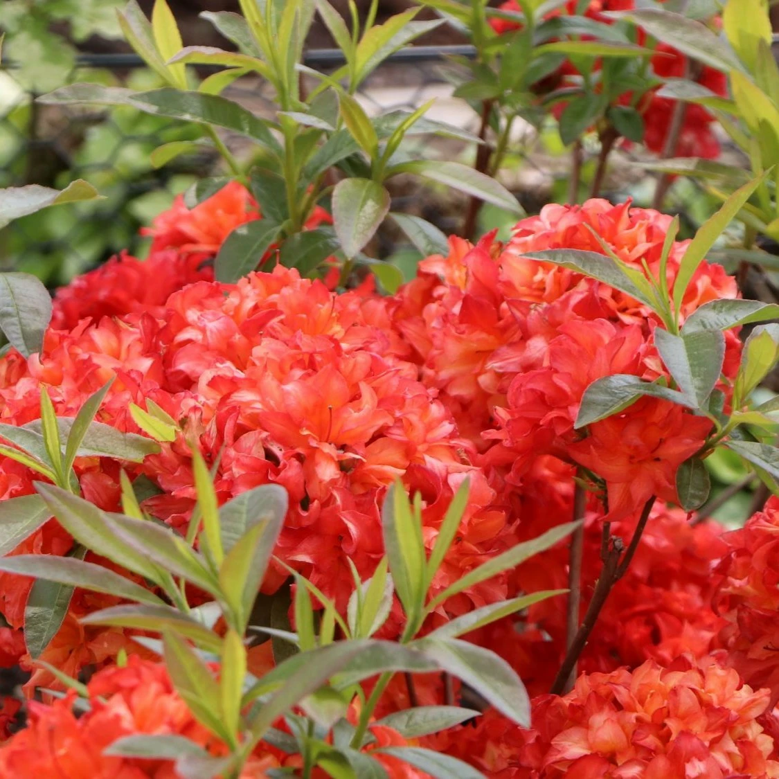 Azalea 'Feuerköpfchen', also known as Rhododendron mixtum 'Feuerköpfchen', is a bold deciduous azalea with fiery red blooms flushed with apricot-orange. Flowering from May to June, it forms rounded clusters of semi-double, lightly fragrant flowers that brighten the late spring garden.