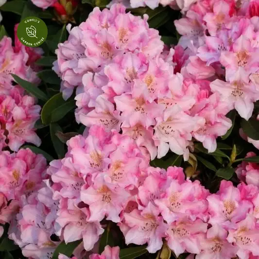 Rhododendron 'Kinderstede' is a robust, evergreen shrub forming a dense, bushy habit with glossy dark green foliage. In late spring, it produces large, rounded trusses of soft pink flowers, creating a bright and elegant display.