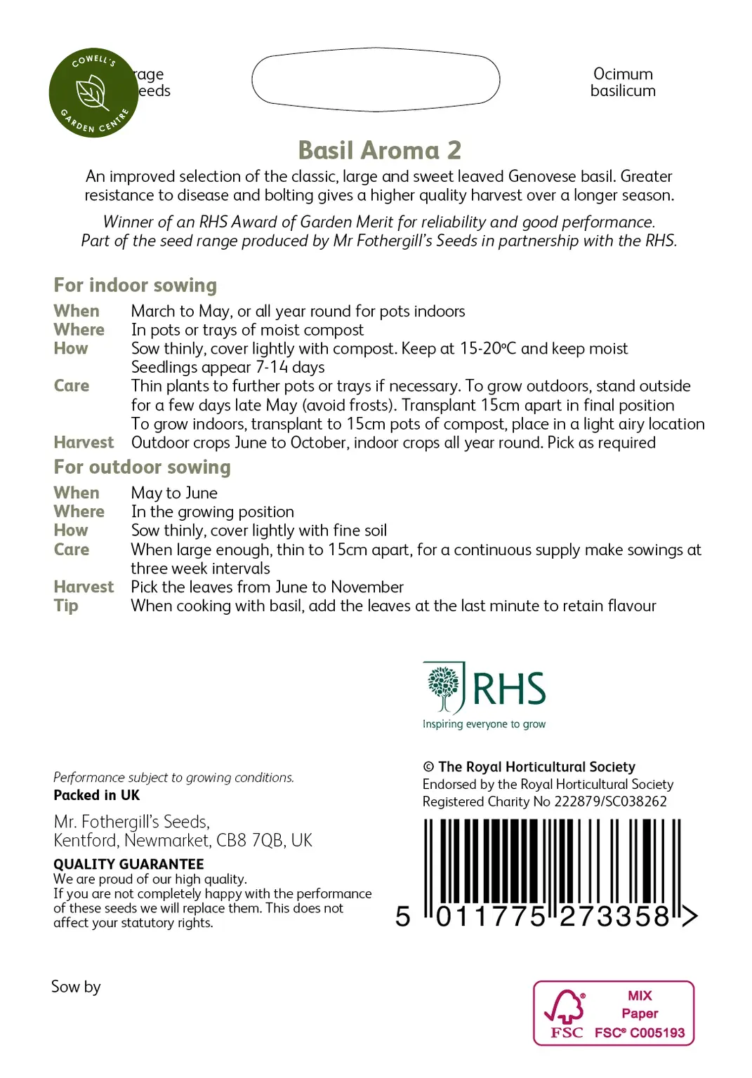 An improved selection of the classic, large and sweet leaved Genovese basil. Greater resistance to disease and bolting gives a higher quality harvest over a longer season. Winner of an RHS Award of Garden Merit for reliability and good performance. Part of the seed range produced by Mr Fothergill’s Seeds in partnership with the RHS.