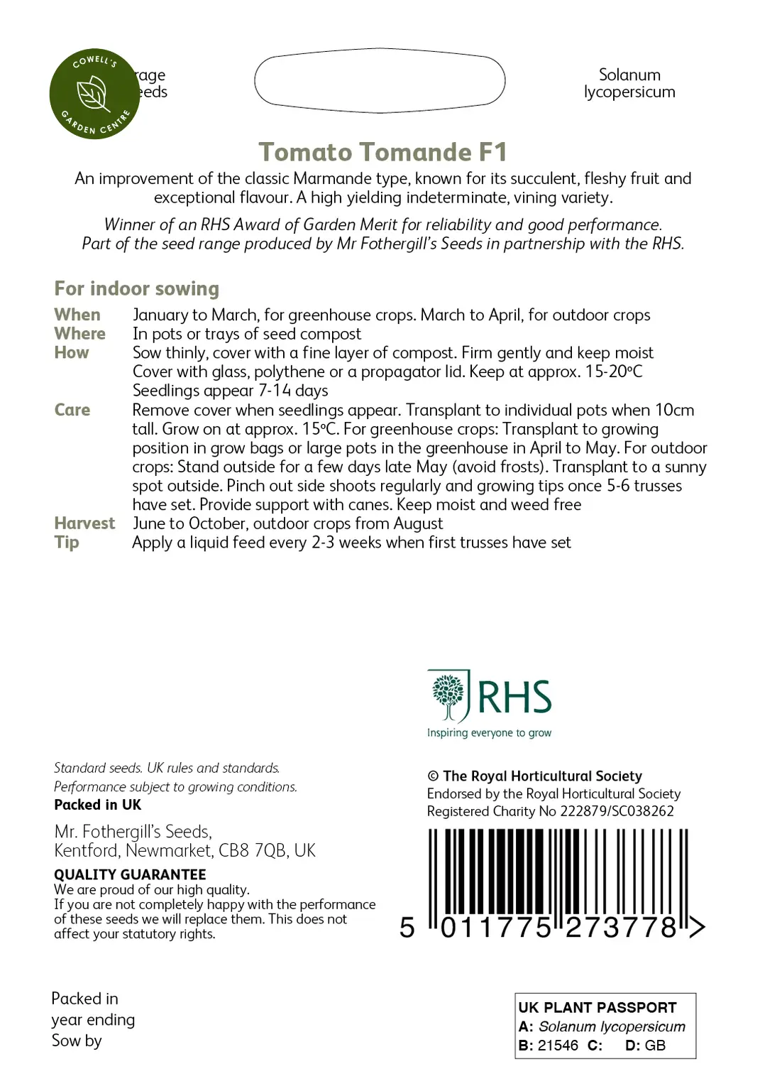- Part of the seed range produced by Mr Fothergill’s Seeds in partnership with the RHS