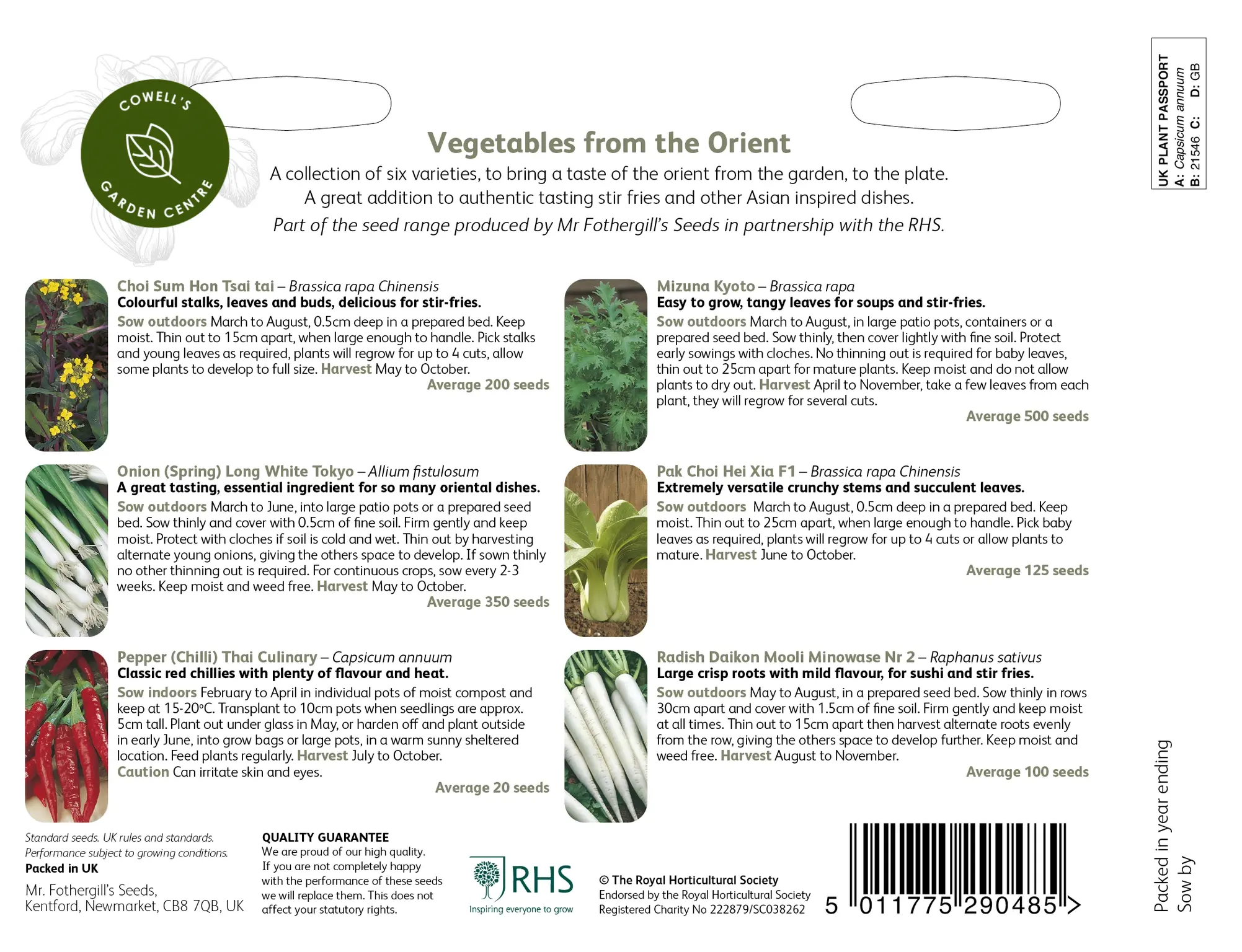 Contains Choy Sum Hon Tsai Tai, Mizuna Kyoto, Spring Onion Long White Tokyo, Pak Choi Hei Xia, Chilli Pepper Thai Culinary, Radish Daikon Mooli Minowase.