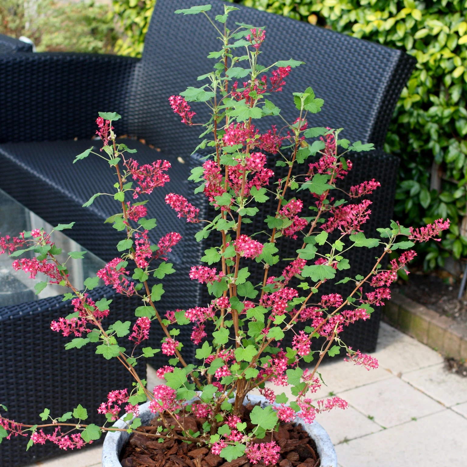 Ribes sanguineum 'Pink Pomp' is a striking deciduous flowering currant, grown for its showy spring display of soft pink, pom-pom-like flower clusters. These elegant blooms appear in early to mid spring, hanging in dense racemes that provide an early splash of colour and nectar in the garden.