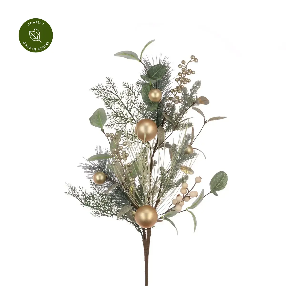 Cool toned artificial wreath of pine foliage, eucalyptus, golden leaves and berries, to use in a table decoration, or to elevate your Christmas displays.