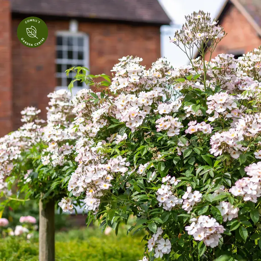 The flowers release a strong, sweet musky fragrance that carries well across the garden. After flowering, the plant produces masses of small oval orange-red hips in autumn, adding seasonal interest. With vigorous, bushy growth and glossy dark green foliage, this rambler is ideal for training over pergolas, arches, trees and large garden structures.