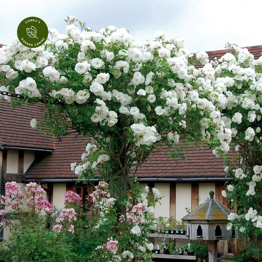 Rose 'Iceberg' is a classic climbing rose renowned for its exceptional flowering performance. Throughout the season it produces large clusters of medium-sized, lightly double white flowers, sometimes delicately tinged with pale pink.