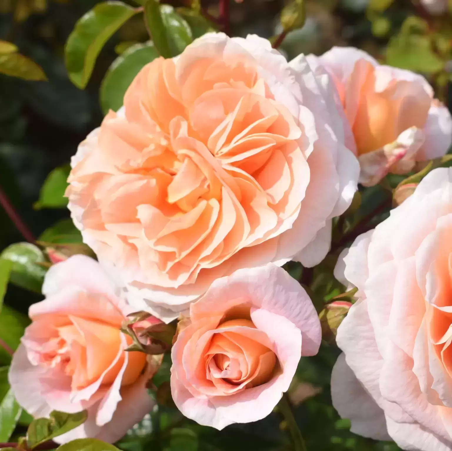 Rose 'It's A Wonderful Life' is a vibrant and uplifting Floribunda Rose, producing a succession of long-lasting blooms in varying shades of orange, pink, and peach. Each flower is packed with over 60 petals, with tones that subtly change with temperature, creating a captivating display throughout the season.