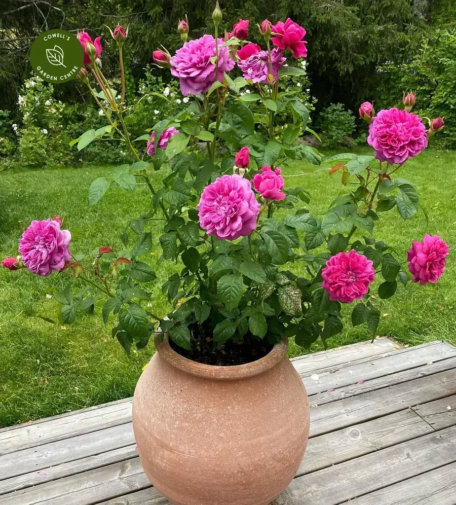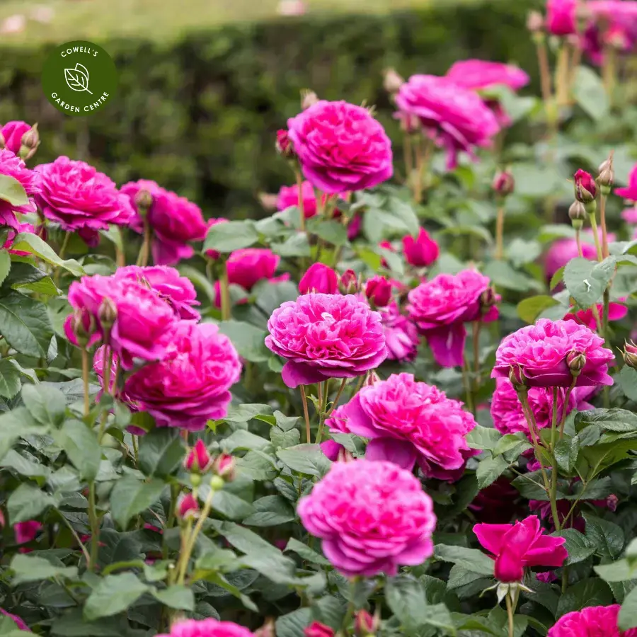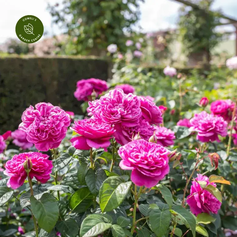 Rosa 'James L. Austin'® is a striking English shrub rose producing large, many-petalled deep pink rosettes, each beautifully formed with a classic button eye. The richly coloured blooms create a bold and elegant display from early summer through to autumn.
