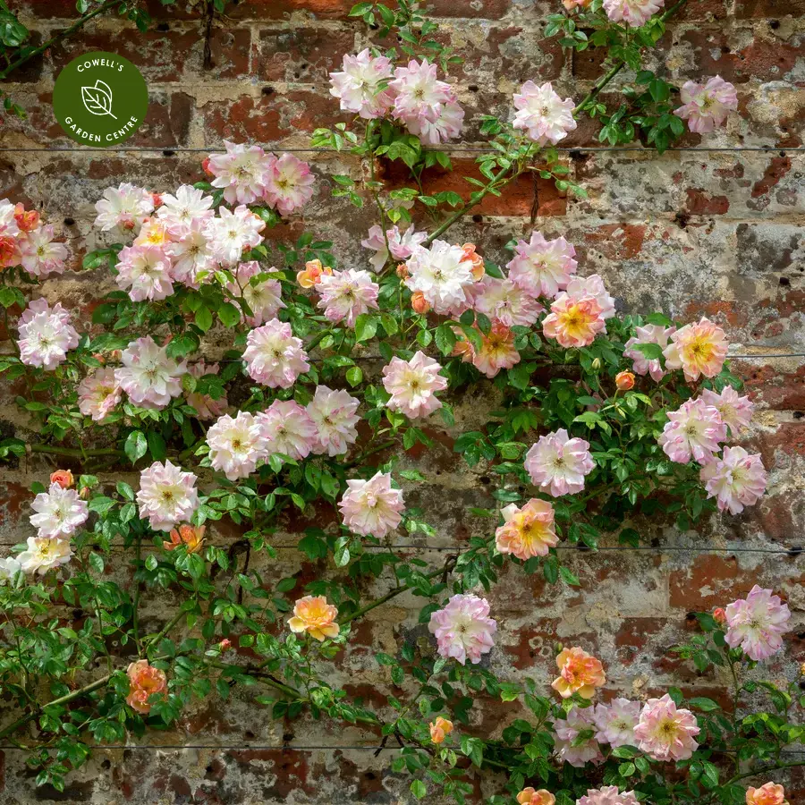 Rosa 'Phyllis Bide' is a charming rambling rose with a truly informal, natural character, producing delightful sprays of small, pale apricot-pink flowers softly flushed with yellow. The narrow, quill-like petals give each bloom a light, airy appearance, creating a gentle and romantic effect.