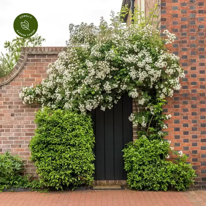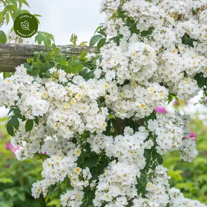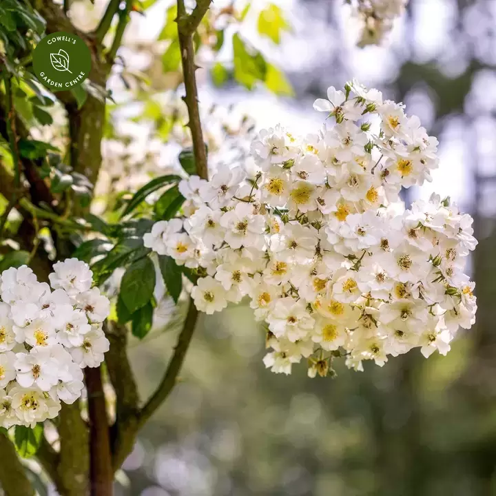 Rose 'Rambling Rector' is a vigorous and free-flowering Rambling Rose, renowned for its large heads of small, semi-double, creamy-white blooms that fade gracefully to pure white. Each flower reveals a cluster of golden-yellow stamens, releasing a powerful musky clove fragrance.