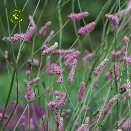 Sanguisorba 'Fire Explosion' is a beautifully airy perennial producing vibrant pink-red bottlebrush flower heads on tall, slender stems. The blooms appear to float above the foliage, creating a soft, natural movement in the garden.