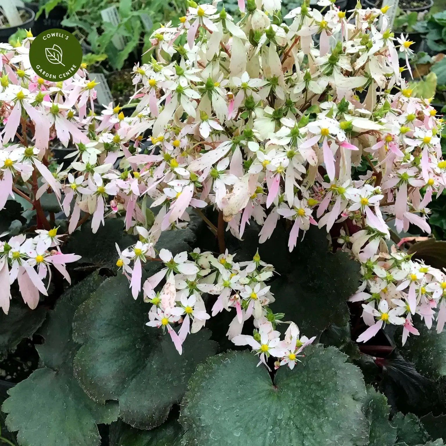 Saxifraga 'Sibyll Trelawney' is a refined, compact perennial producing delicate, star-shaped flowers in soft pink and white tones, often with elegantly elongated petals. Held on fine, wiry stems, the blooms create a light, airy display above neat, evergreen foliage.
