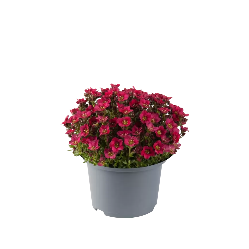 Saxifraga × arendsii 'Ice Colours Red' is a charming mat-forming alpine that produces masses of vivid red flowers with soft, velvety petals from March to May. The blooms rise above compact rosettes of fresh green foliage, creating a bright carpet of spring colour ideal for rock gardens, walls, or the front of borders.