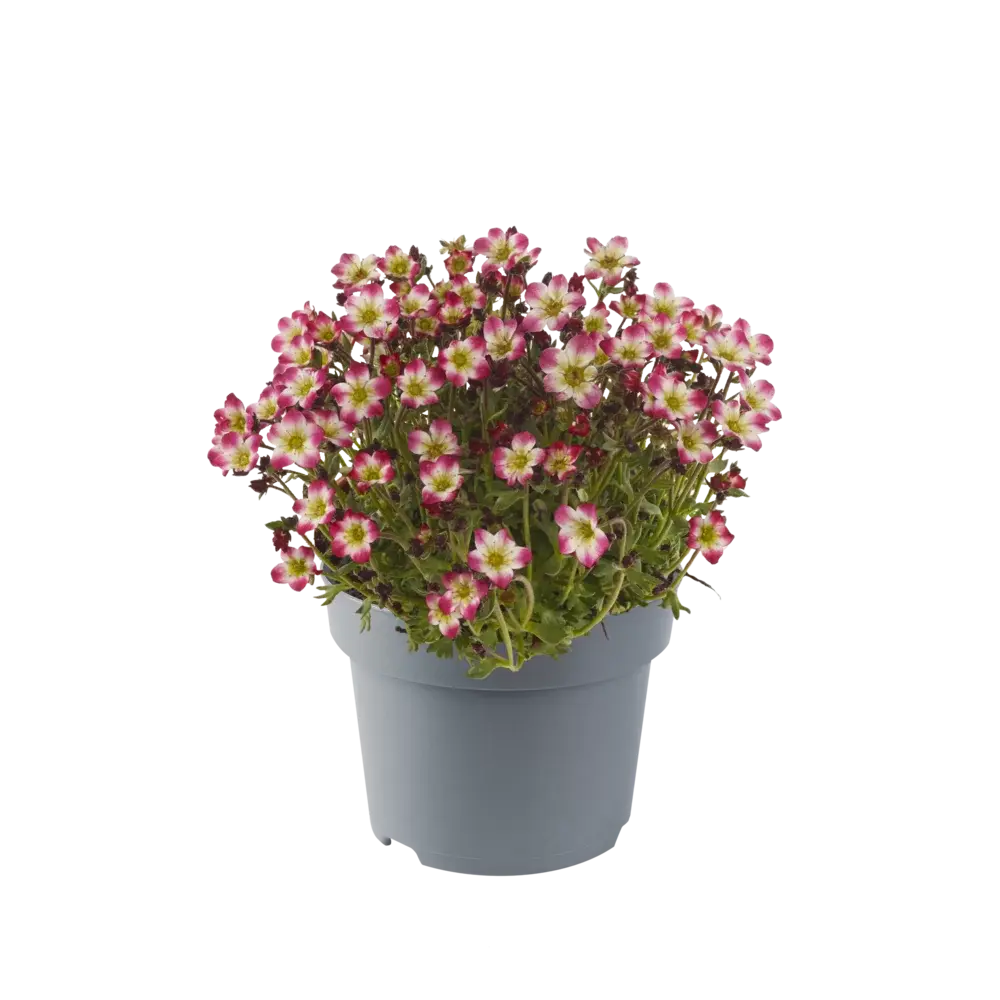 Saxifraga × arendsii 'Marto Red Picotee' is a charming alpine perennial forming a compact, evergreen cushion of neat, mossy foliage. From March to May, it produces masses of delicate, cup-shaped flowers in shades of rose-red with soft white-edged petals, creating a vibrant, eye-catching display perfect for rockeries, walls, and containers.