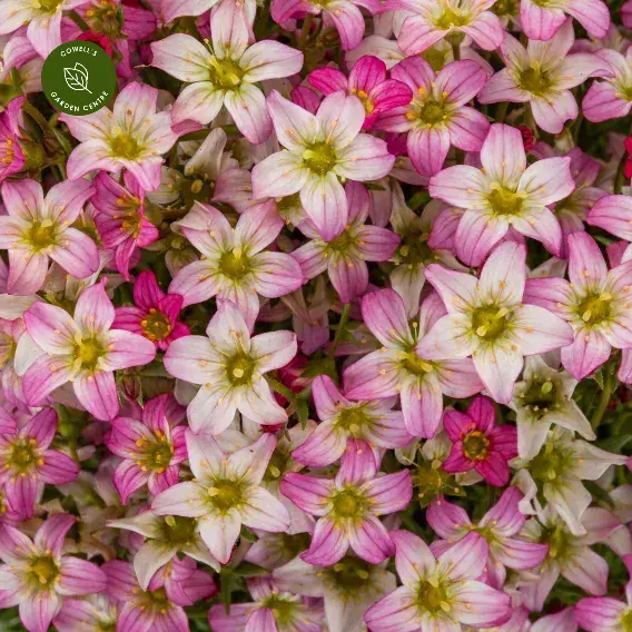 Saxifraga × arendsii 'Touran Pink' is a low-growing, cushion-forming alpine producing an abundance of starry pink flowers, each highlighted with a deeper pink eye. Flowering freely above the foliage, it creates a bright, cheerful display that brings delicate detail and charm to rockeries and alpine plantings.