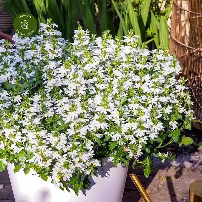Scaevola Surdiva Series is a premium range of trailing summer plants, prized for their exceptional flowering performance and weather resilience. Producing masses of distinctive fan-shaped flowers, they create a vibrant, cascading display.
