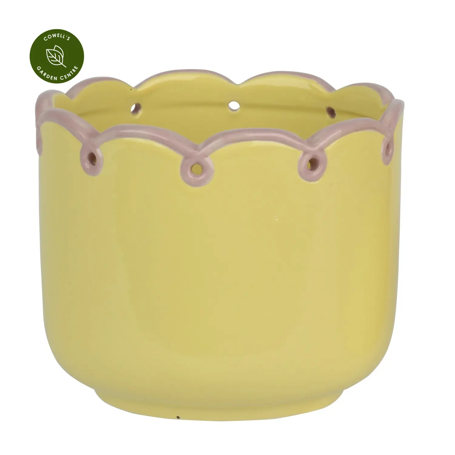 Add a playful, retro touch to your indoor plant displays with this ceramic houseplant planter. Finished in soft yellow with a contrasting pink scalloped edge, it brings colour and character to shelves, windowsills, and tabletops.