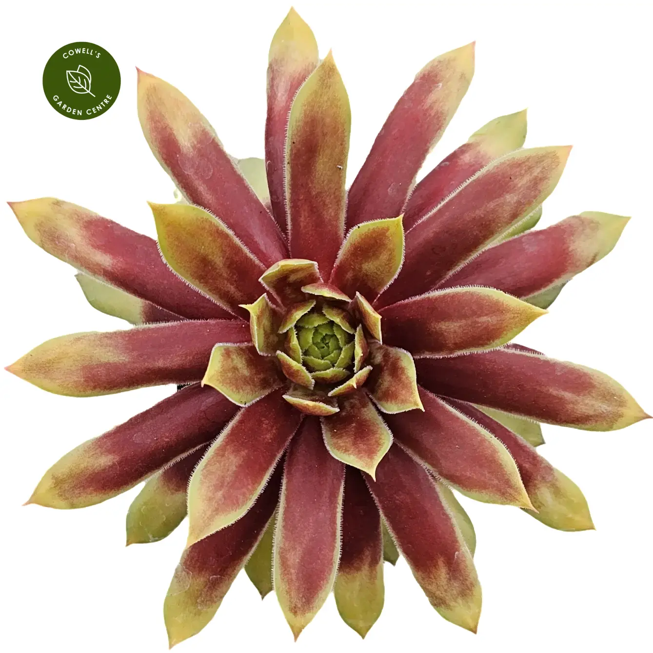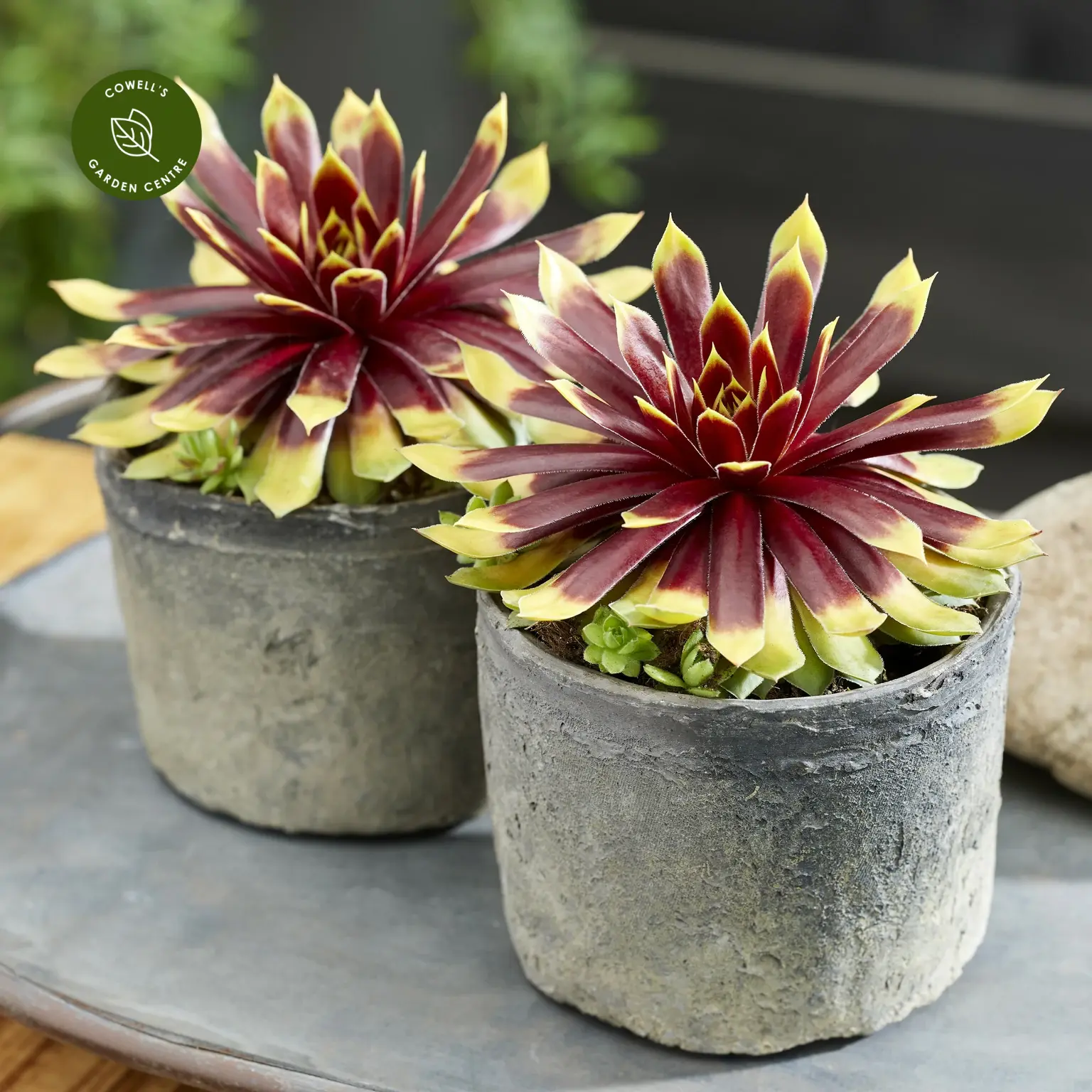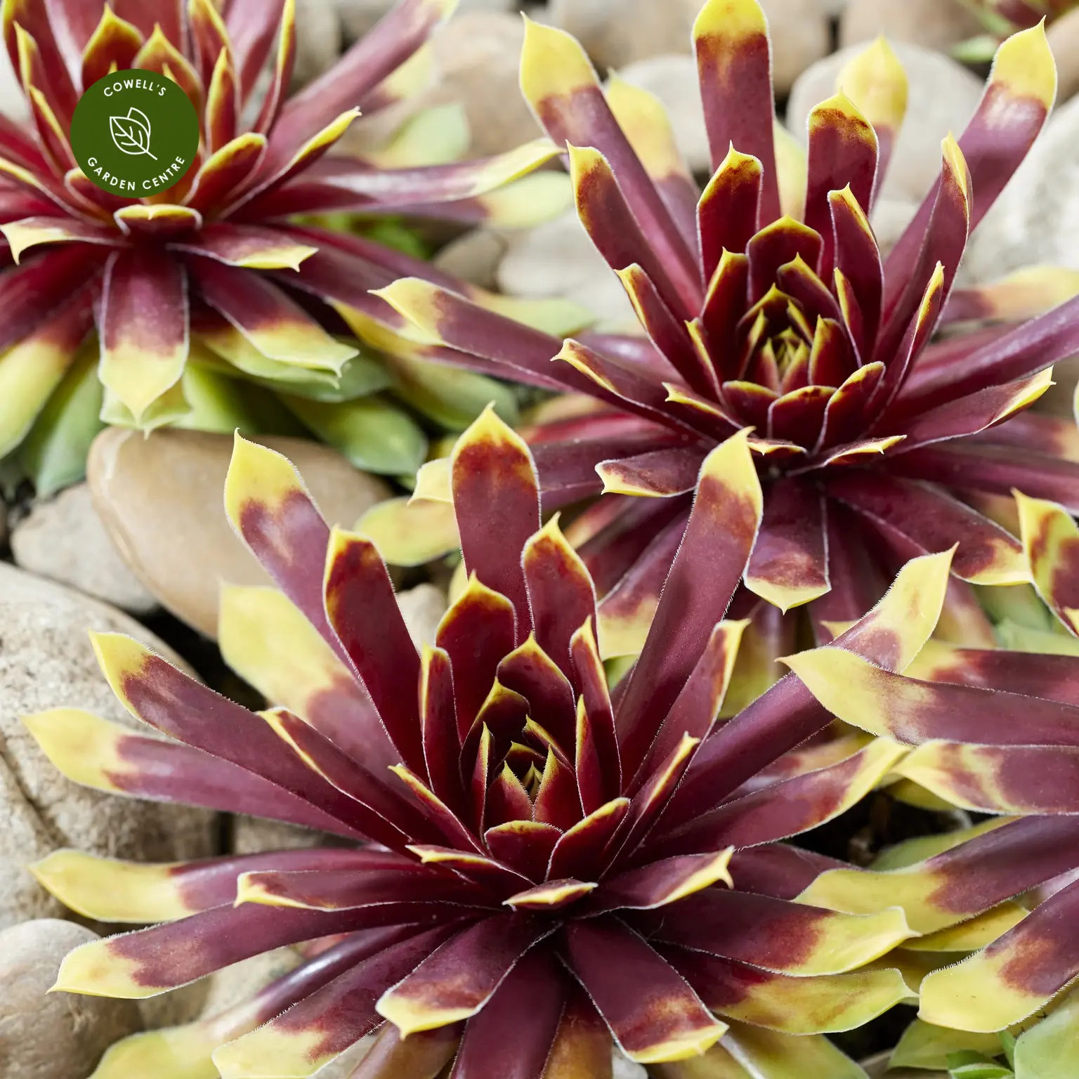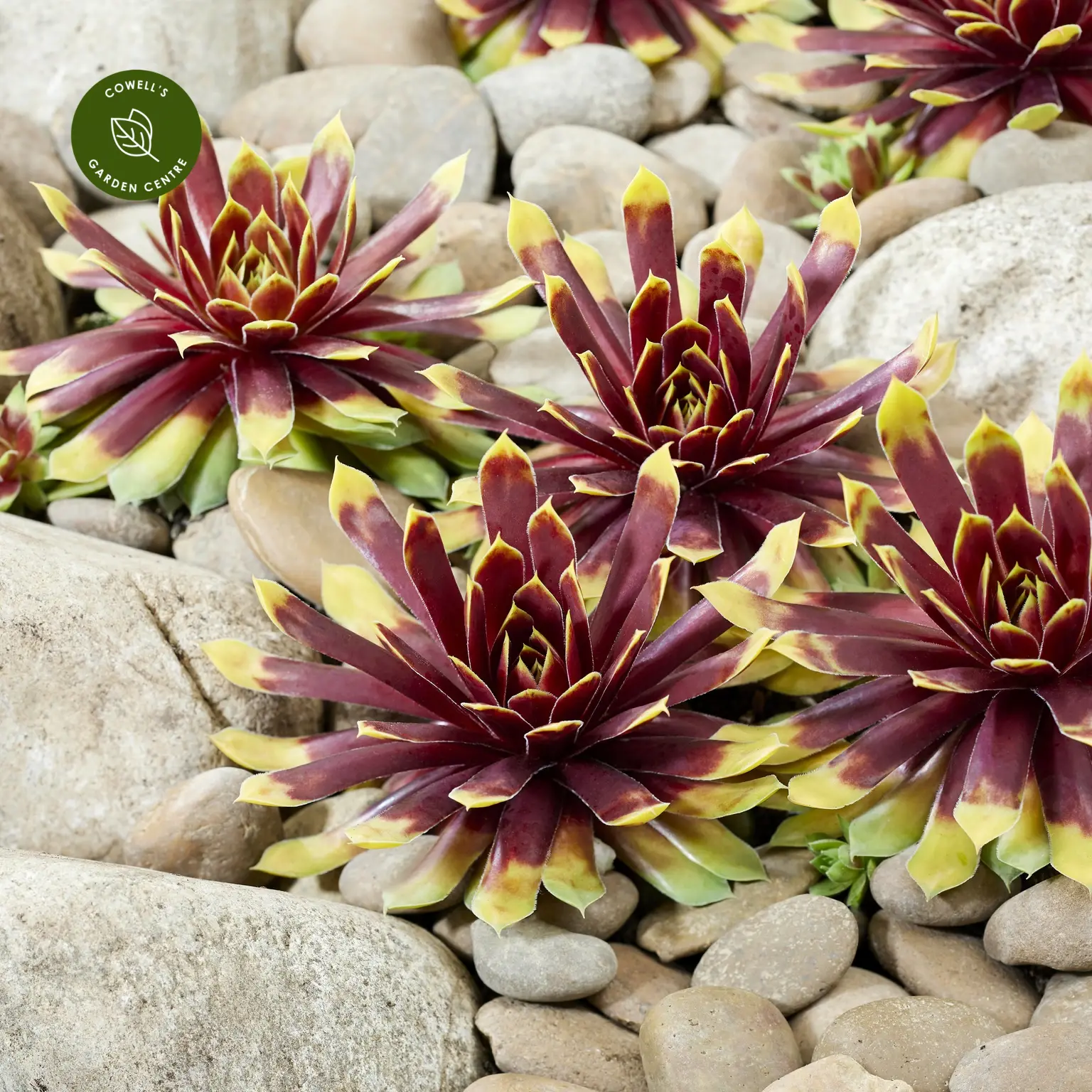Sempervivum Chick Charms® 'Gold Rush' is a brilliantly coloured hardy succulent, combining ruby-red and bright golden tones that intensify in full sun. Developed over more than four years of breeding, this eye-catching variety brings vivid colour to rockeries, walls, containers and drought-tolerant planting schemes.