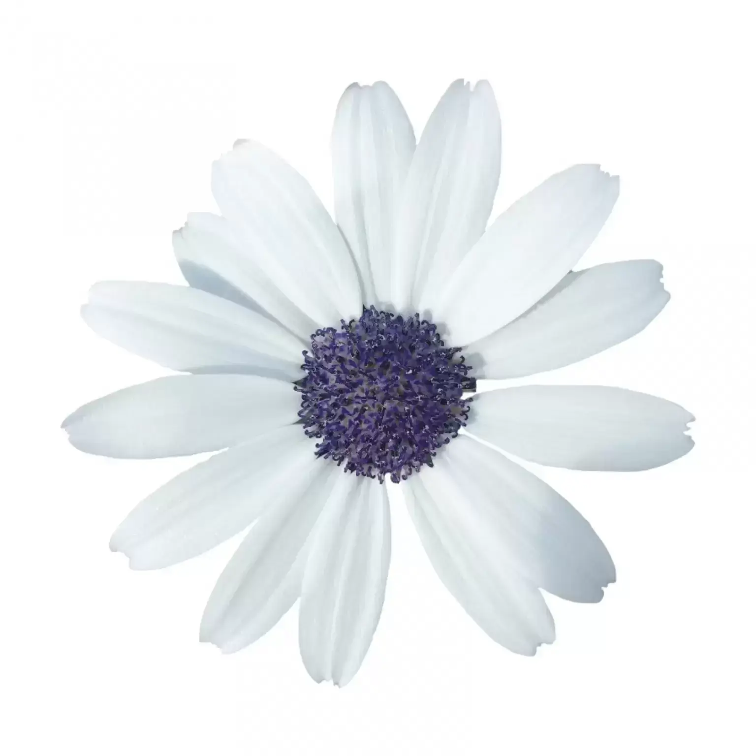 - Pure white flowers with a striking dark blue centre
