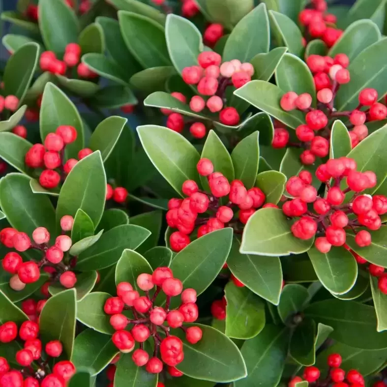 Skimmia 'Obsession'® is a compact, female evergreen shrub with year-round appeal. Its glossy, dark green foliage is the perfect backdrop for fragrant panicles of small white flowers in spring, which emerge from eye-catching red buds. In autumn and winter, the plant is further enhanced by its striking foliage colour, with young leaves flushed red, adding warmth and vibrancy to the colder months.