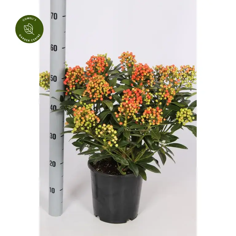 Skimmia japonica 'Pabella' is a compact, self-fertile evergreen shrub valued for its fragrant white spring flowers and long-lasting red berries. The glossy dark green foliage provides a perfect backdrop for its vivid fruit, which persists through winter to brighten shaded borders and containers. As a self-fertile variety, no male pollinator is required for berry production.