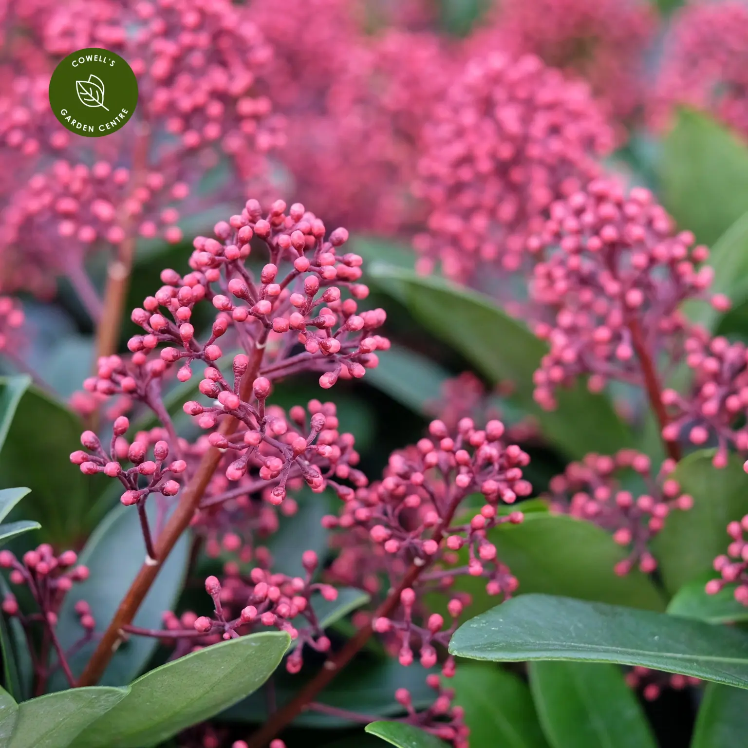 Skimmia 'Rubella' is a compact, evergreen shrub prized for its decorative buds and foliage. This male variety forms dense clusters of deep red flower buds in autumn, which persist throughout winter to provide colour and seasonal interest. In spring, the buds open into fragrant white flowers, offering a striking contrast against the glossy, dark green leaves.