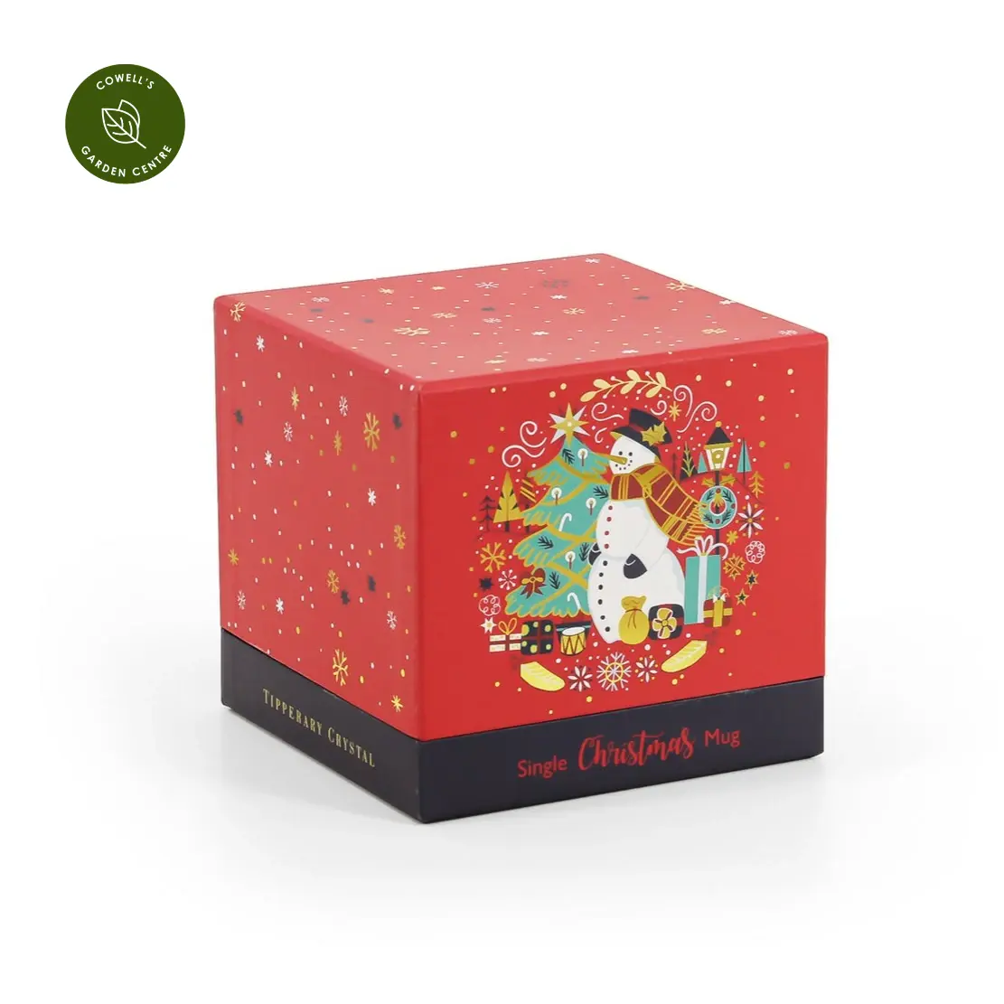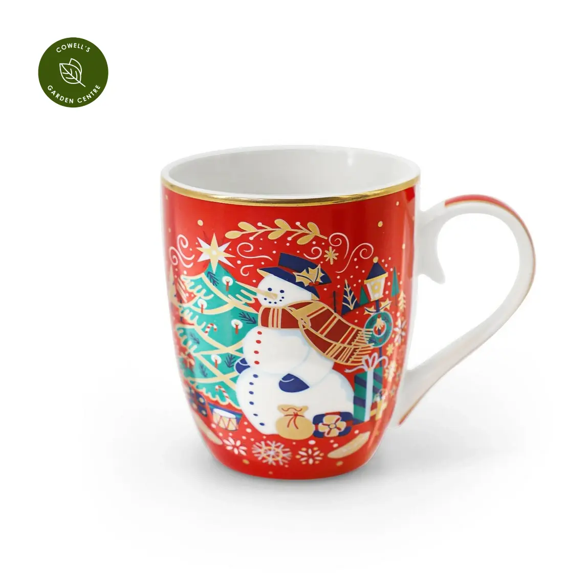 A festive mug featuring a festive snowman scene, made from bone china with golden accents and curved handle. Presented in a stylish gift box — the perfect Christmas gift to share.