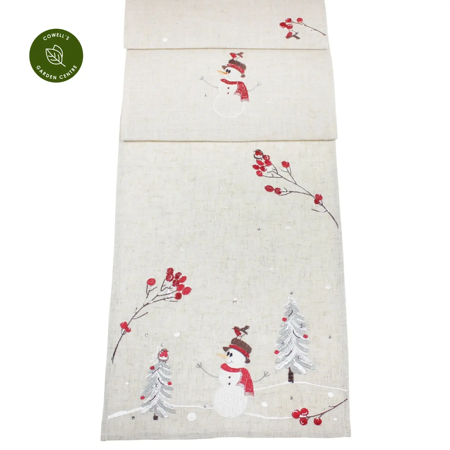 Bring some traditional charm to your festive decor with the Snowman & Robin collection, featuring an embroidered design of a festive snowman and robins enjoying the winter wonderland, set on a natural fabric background. This rustic table runner is perfect for creating a classic seasonal atmosphere at the dining table.