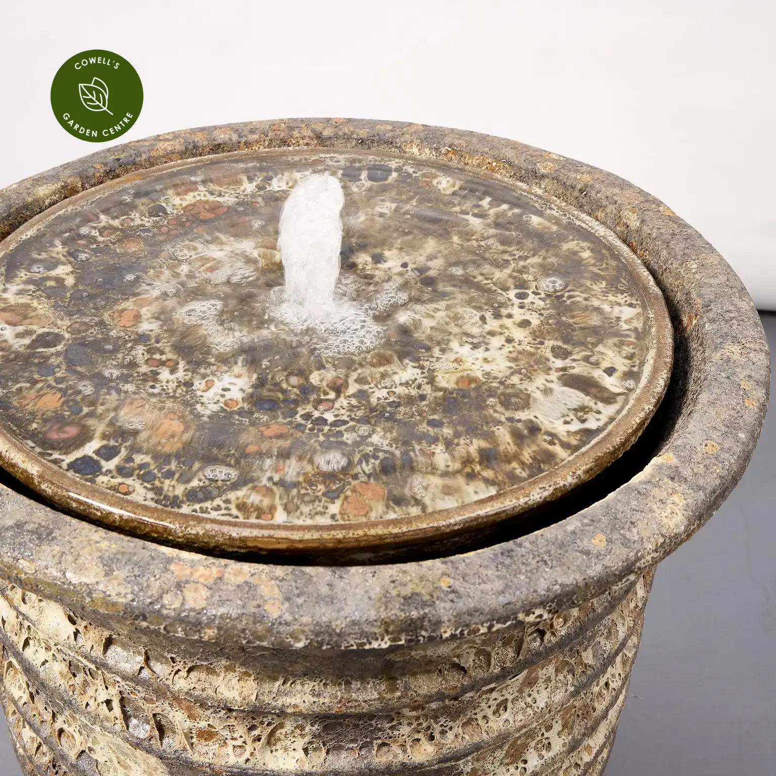 A stunning rustic brown feature with a combination of flowing water and soft lighting. Ideal for creating an intimate garden setting.