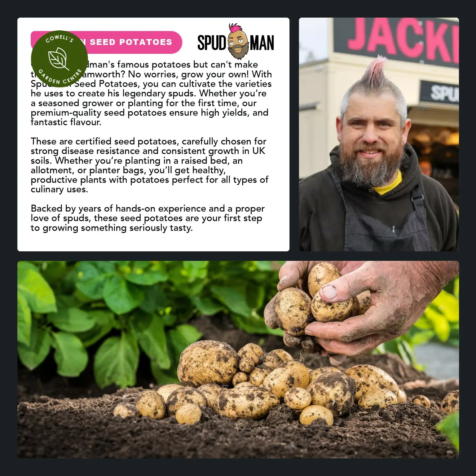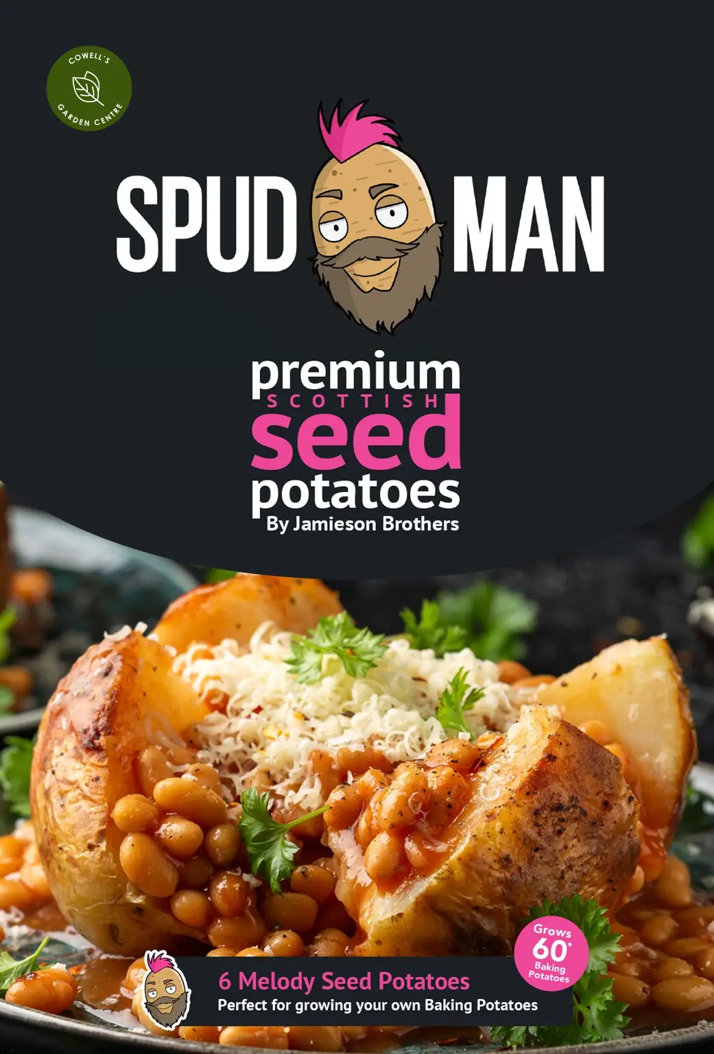 Spudman Melody is a high-yielding maincrop potato producing smooth, yellow-skinned tubers with firm, creamy flesh and excellent all-round flavour. This is the variety famously used by Spudman.