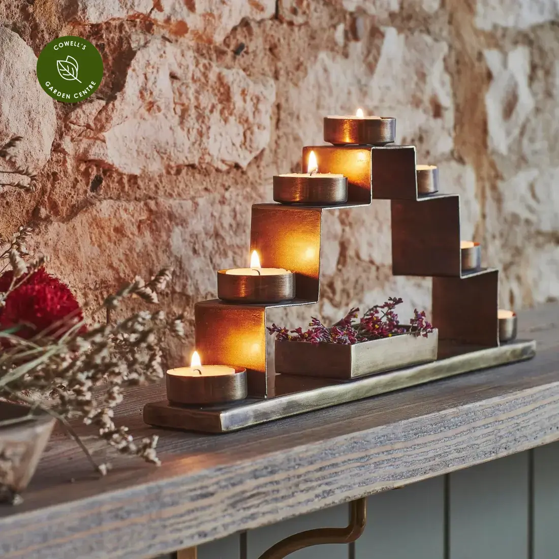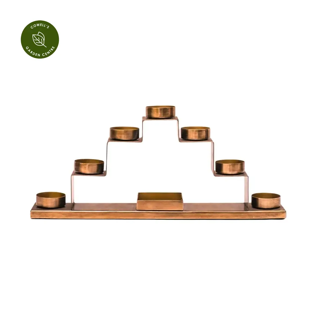 This tealight candle holder is a sophisticated and lavish addition to your Christmas decorations that could sit on top of a fireplace or any ledge around your home. With three tiers on either side meeting with a fourth in the centre, this antique brass piece is a real statement that oozes luxury. It also boasts a décor box at the bottom, allowing you to add any final touches you may desire.