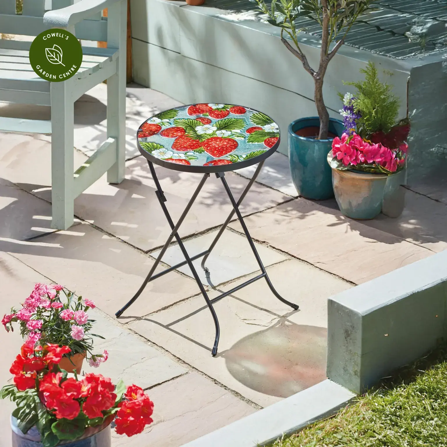 Bring colour and character to your home or garden with this eye-catching strawberry glass table. Featuring a beautifully hand-painted glass top, it’s perfect as a small side table for patios, balconies or indoor spaces. The foldable base makes it easy to move and store, while the decorative design also makes it a lovely gift.