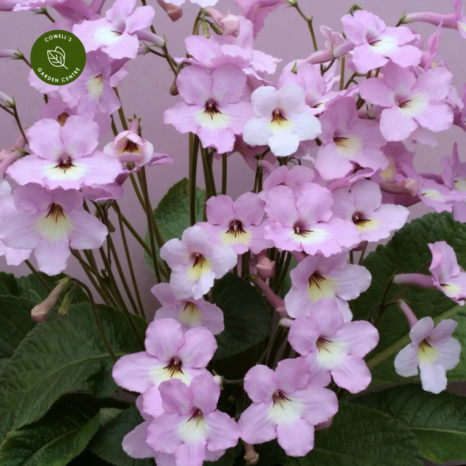 Streptocarpus ‘Hannah’ is a soft and elegant flowering houseplant producing masses of pale pink blooms with creamy throats and subtle yellow centres. The delicate, trumpet-shaped flowers are held on slender stems above velvety green foliage, creating a light and airy display that brings gentle colour to indoor spaces.