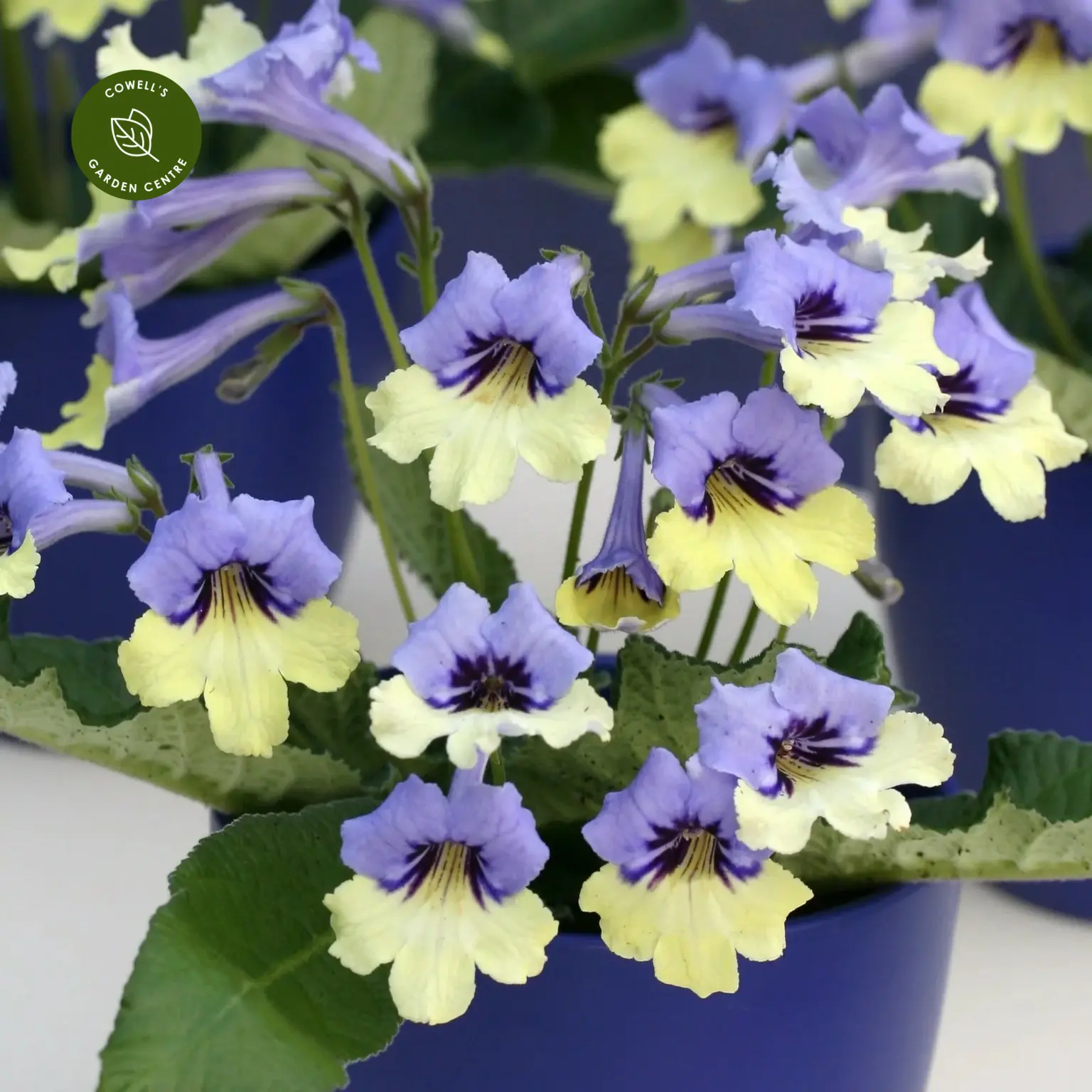 Streptocarpus ‘Harlequin Blue’ is a beautifully distinctive flowering houseplant with bi-coloured blooms in soft lavender-blue and creamy yellow. Each flower features a deep purple throat with delicate veining, creating a striking contrast and a refined, almost painterly appearance above the velvety green foliage.