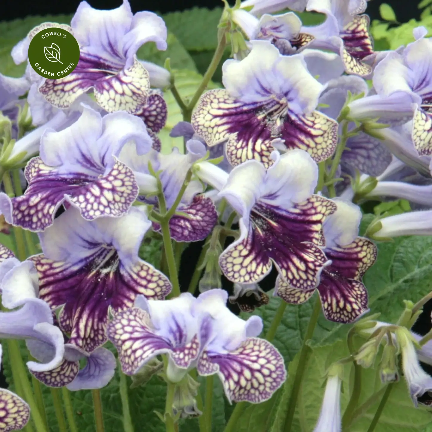 Streptocarpus ‘Harlequin Blue’ is a beautifully distinctive flowering houseplant with bi-coloured blooms in soft lavender-blue and creamy yellow. Each flower features a deep purple throat with delicate veining, creating a striking contrast and a refined, almost painterly appearance above the velvety green foliage.