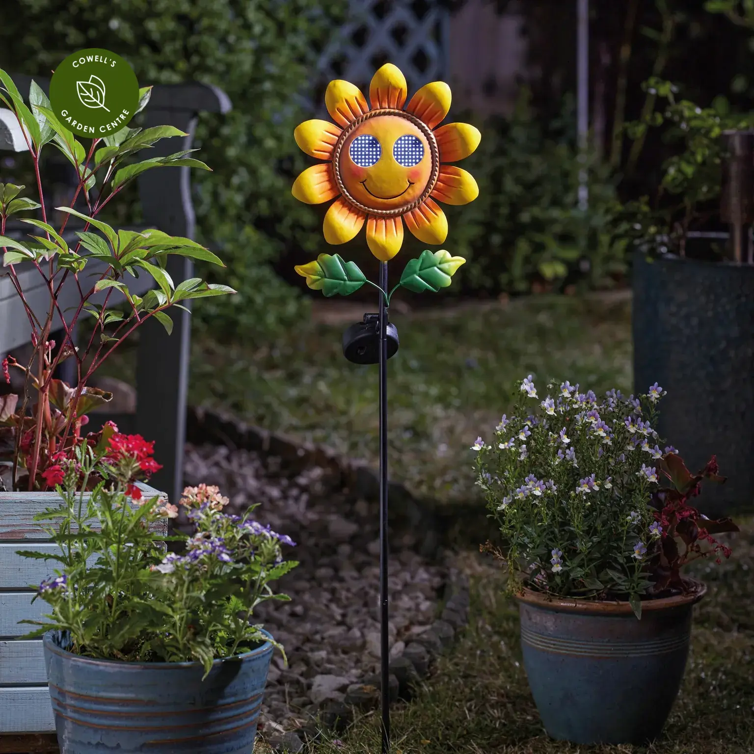 Add a playful touch to your garden with this eye-catching solar sunflower stake light. Hand-painted in metal for a decorative finish, it creates a fun feature by day and comes to life at night with blinking, winking illuminated eyes. Easy to place in borders, beds or along pathways, it charges during the day and lights up automatically after dark.