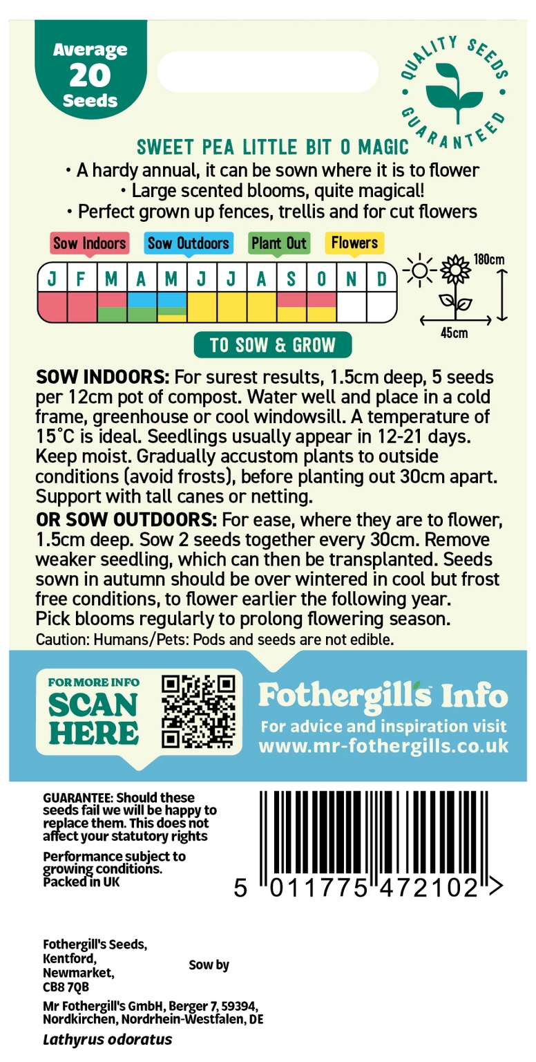 Sweetly scented, climber and cut flower. Seedlings are best protected against bird damage with a few short twigs. Autumn sowings should be over wintered in cool but frost free conditions.