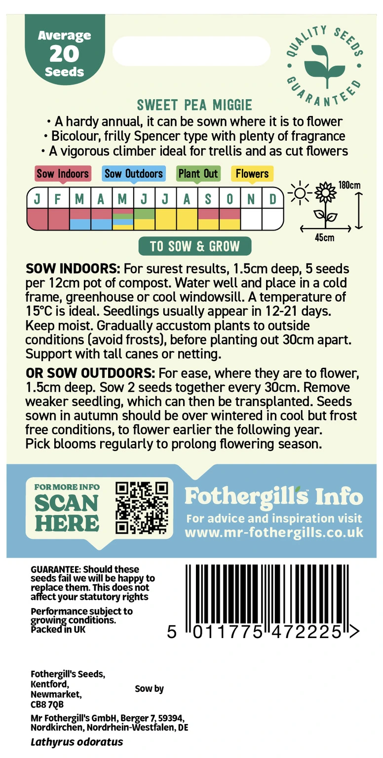Spencer type, with good scent. Seedlings are best protected against bird damage with a few short twigs. Autumn sowings should be over wintered in cool but frost free conditions.