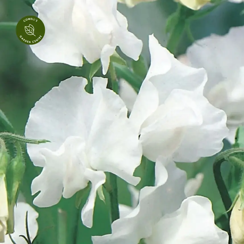 Lathyrus 'Swan Lake' is a graceful annual sweet pea producing masses of pure white, lightly scented flowers throughout summer. Its elegant blooms and climbing habit make it perfect for adding height and softness to trellis, arches, obelisks and fences.