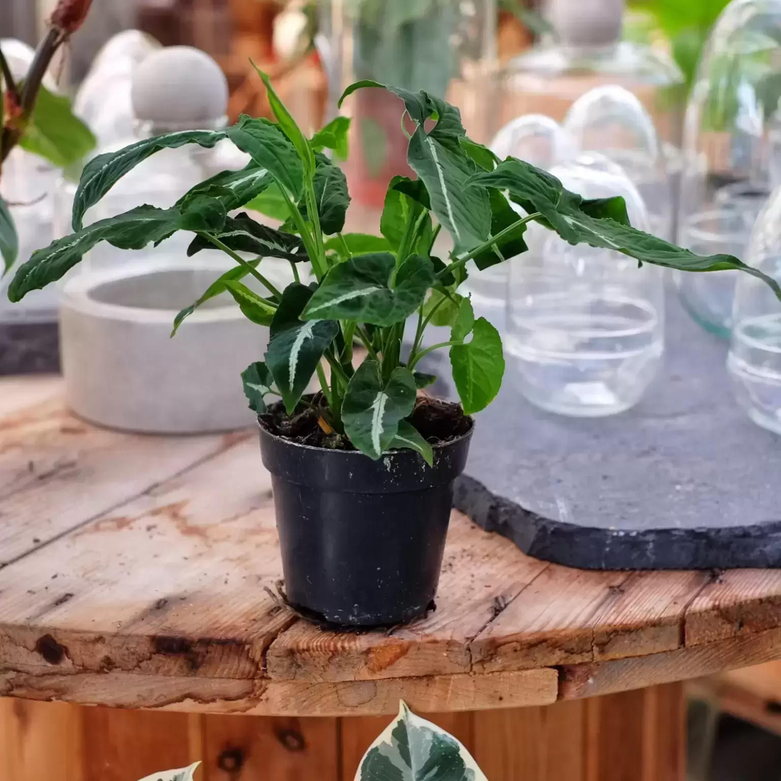 Syngonium wendlandii is an elegant tropical houseplant with deep green, velvety leaves highlighted by striking silvery-white central veins. The arrowhead-shaped foliage gives it a lush, jungle-like appearance, remaining compact in its early stages before developing a graceful climbing habit as it matures.
